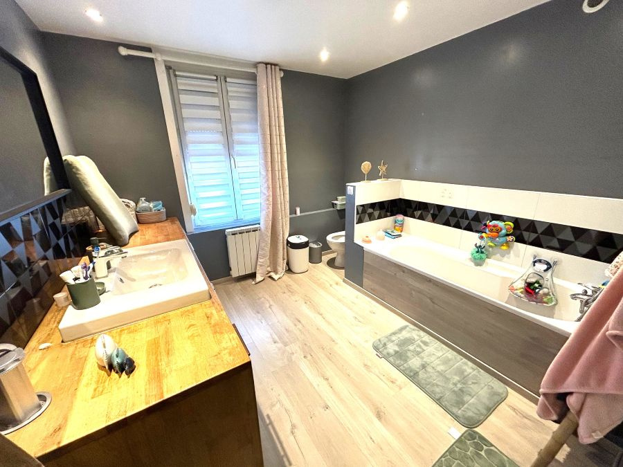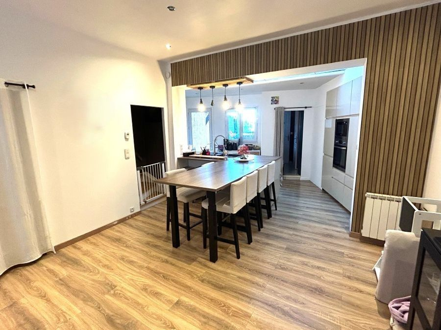 Située proche des commodités, bon état pour cette maison mitoyenne des années 30 développant 120m2 de superficie habitable et bâtie sur une parcelle de 406m2. Comprenant : hall d'entrée avec verrière ouvert sur la pièce de vie pour une superficie de 48m2 environ comprenant la cuisine équipée ouverte avec ilôt central et coin repas. Rangements sous escalier, cave, dégagement, WC, buanderie/chaufferie. Au premier étage : couloir, grande chambre de 19m2 avec placards de rangement, grande salle de bains avec baignoire, vasque et douche. Au second : sas : 2 chambres aménagées dans les combles de chacune 16,85m2 au sol. Chauffage électrique, tout à l'égout, double vitrage PVC, volets roulants manuels, fibre optique. A l'extérieur : cuve de récupération des eaux de pluie, grande terrasse carrelée, jardin clos, garage de 44m2 accès arrière, porte manuelle. A visiter !!